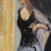 Een vrouw met zilverkleurige kleding met vogeltje( puttertje ) op haar hand.