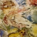 Een oosters lijkend, abstract schilderij in warme tinten, voornamelijk rood, oranje en wit.