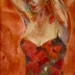 Een acryl schilderij van een vrouw in levendige oranje en rode kleuren. De stijl is impressionistisch met zichtbare penseelstreken.(Verkocht)